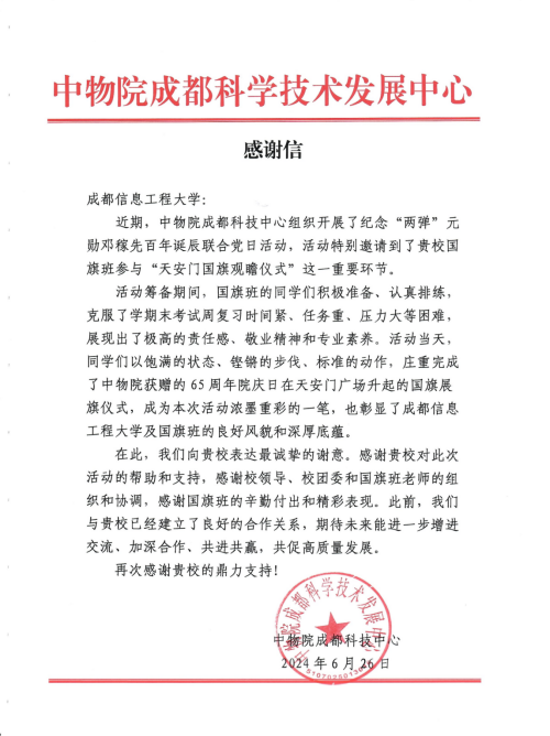 近日,中物院成都科学技术发展中心向我校发来感谢信,对我校在“两弹”元勋邓稼先百年诞辰活动中给予的支持和帮助表达诚挚的感谢,对我校国旗班在活动中的辛勤付出和精彩表现予以高度赞扬。