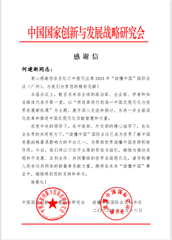 近日,我校校长何建新收到中国国家创新与发展战略研究会、读懂中国国际会议秘书处发来的感谢信。感谢何建新出席2024年“读懂中国”国际会议(广州)并分享精彩见解。